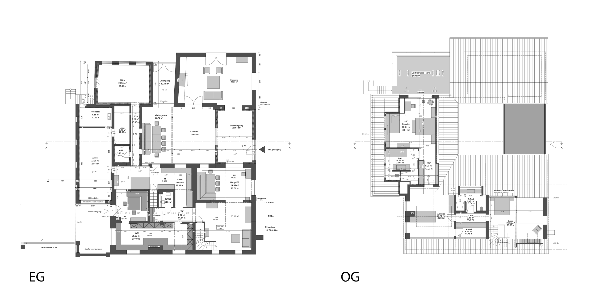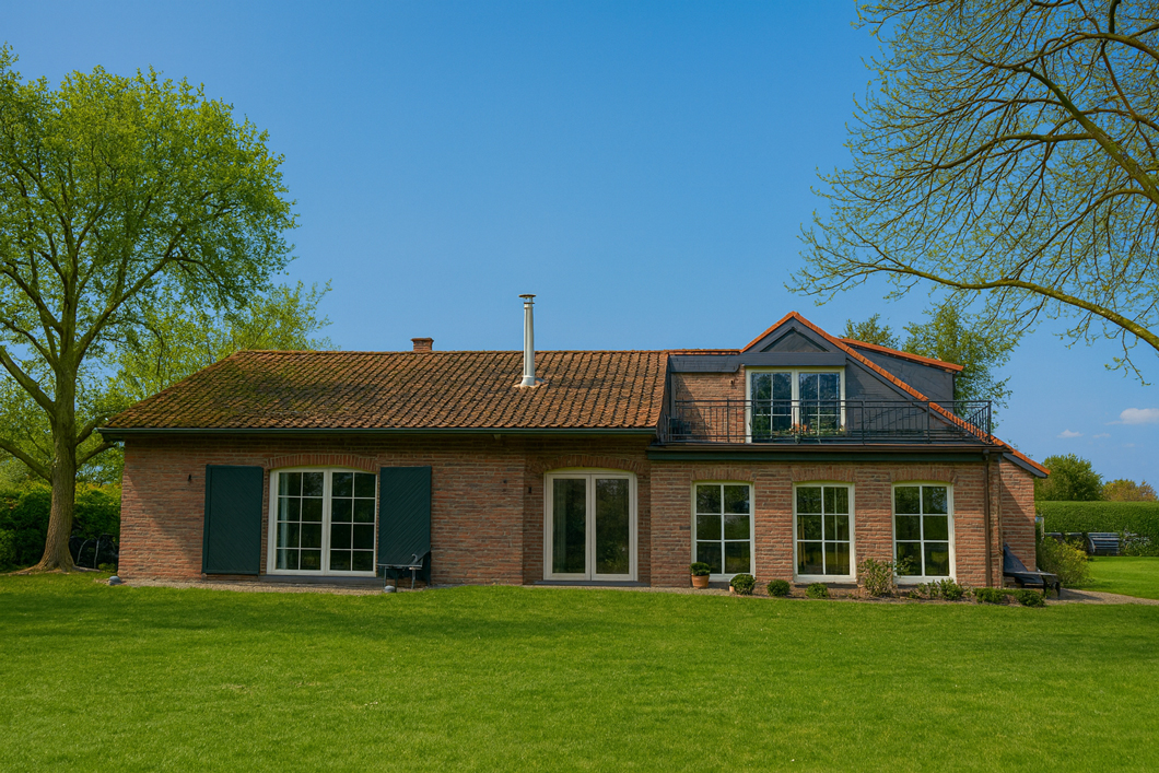 Der Grundriss orientiert sich konsequent an einer klaren Zonenlogik: öffentliche Wohnbereiche entlang der Fassade mit großzügigem Außenbezug, ruhigere Privatbereiche in den rückwärtigen Zonen, ergänzt durch funktionale Nebenräume. Die Verschmelzung von Altbestand und neuen Bauteilen zeigt sich in präzise gearbeiteten Details – modernen Rahmenprofilen, überarbeiteten Klinkerflächen und behutsam integrierten Gauben