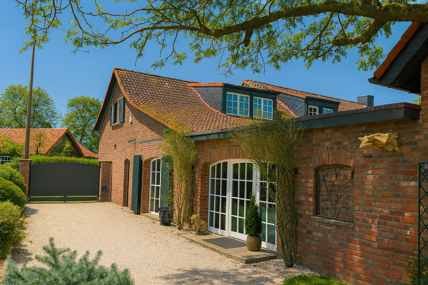 Der Baukörper folgt der Logik traditioneller Hofarchitektur: langgestreckt, niedrig, geprägt durch Ziegelfassaden, Rundbogenöffnungen und ein regionaltypisches Ziegeldach. Die ehemaligen Werkstattbereiche wurden geöffnet, mit großformatigen Sprossenfenstern versehen und gezielt zu Wohnzonen umgestaltet.